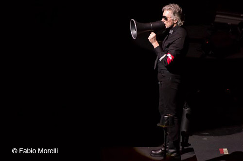 In perfetto orario le luci si spengono e il palazzetto si trasforma. Lo spettacolo non si vede dalle tribune: lo spettacolo sono le tribune stesse. Una contraerea circonda la platea con effetto dolby, occhi di bue scandagliano il pubblico nascosto nella penombra, un aereo si abbatte sui pezzi di muro al lato del palco e prende fuoco tra esplosioni pirotecniche: In The Flesh ci spinge a colpi di scena nella ferita di Waters, nel dramma di The Wall.