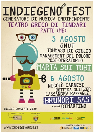 Non è un caso infine se quasi tutto il cast artistico fonda le sue radici proprio nella Magna Grecia, culla delle arti e della cultura del Mediterraneo. Cantautorato ed indie-rock tutto questo e altro ancora è la prima edizione di Indiegeno Fest - generatore di musica indipendente.